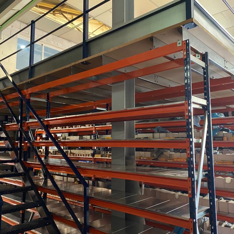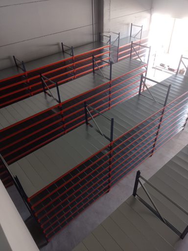 Sin duda la forma de optimizar al máximo el espacio de un almacén. Consiste en continuar las estanterías hasta la máxima altura que nos permitan las instalaciones y colocar pasillos elevados entre las estanterías para los accesos a las cargas.