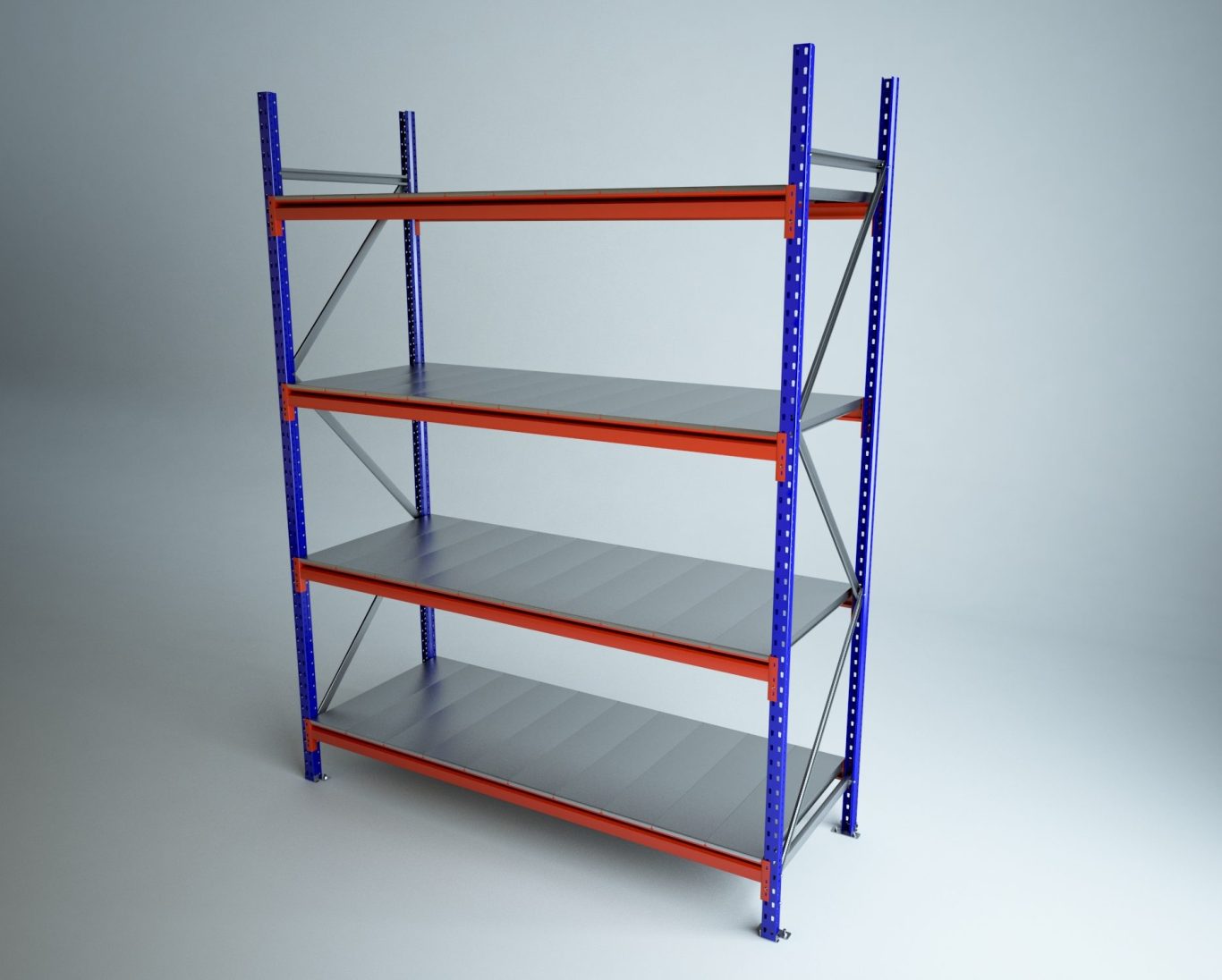 La estantería de media carga convencional esta compuesta por alineaciones de bastidores que a su vez están formados por puntales (que forman los pilares azules) unidos entre si por una serie de diagonales y horizontales atornillados entre si. Una vez que tenemos los bastidores, éstos se unen con largueros naranjas que forman las bases estructurales para posteriormente colocar colocar la superficie de los estantes bien sean metálicos o de madera.